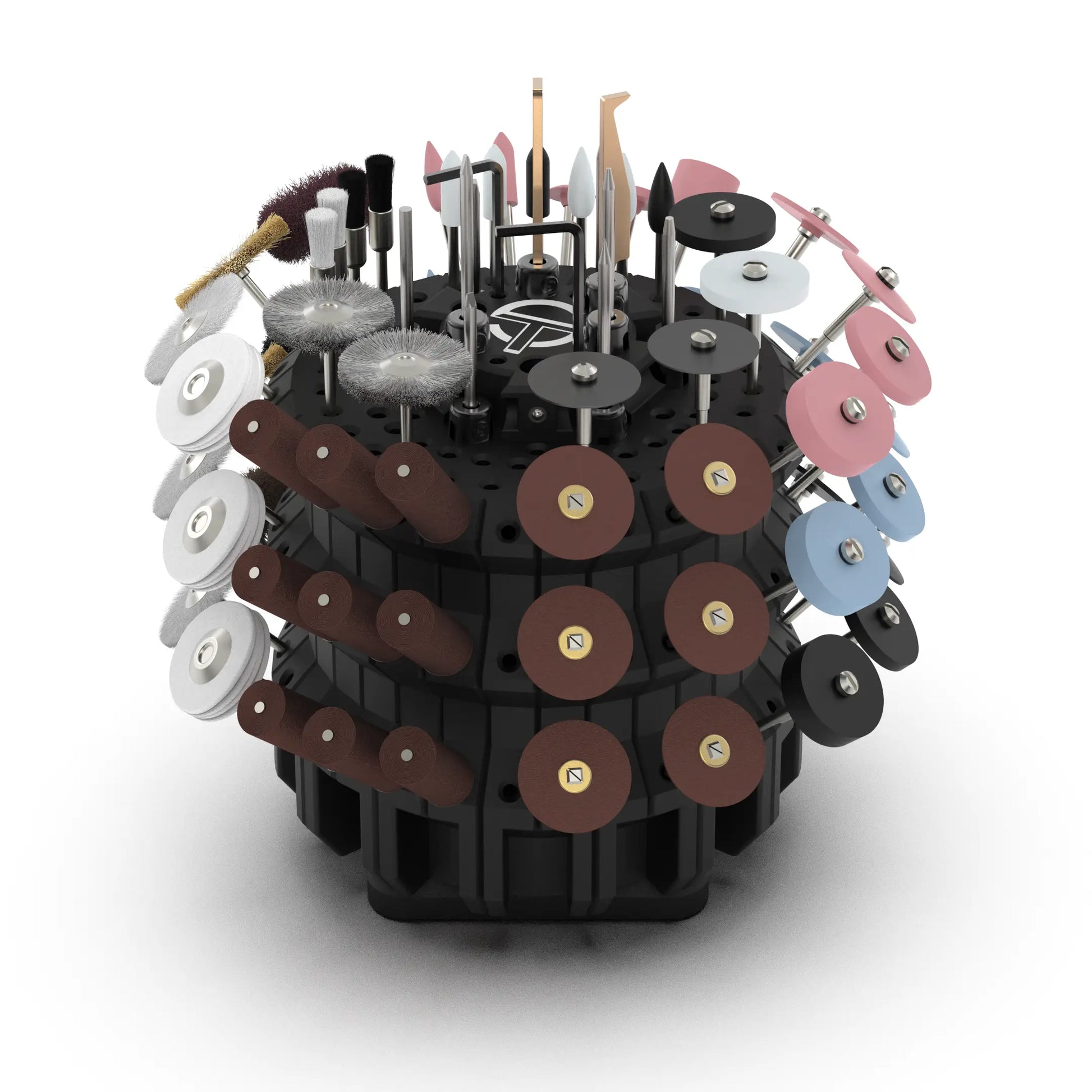 Use each of the three tiers to group finishing tools, abrasives, and burs by grit, shape, or job.